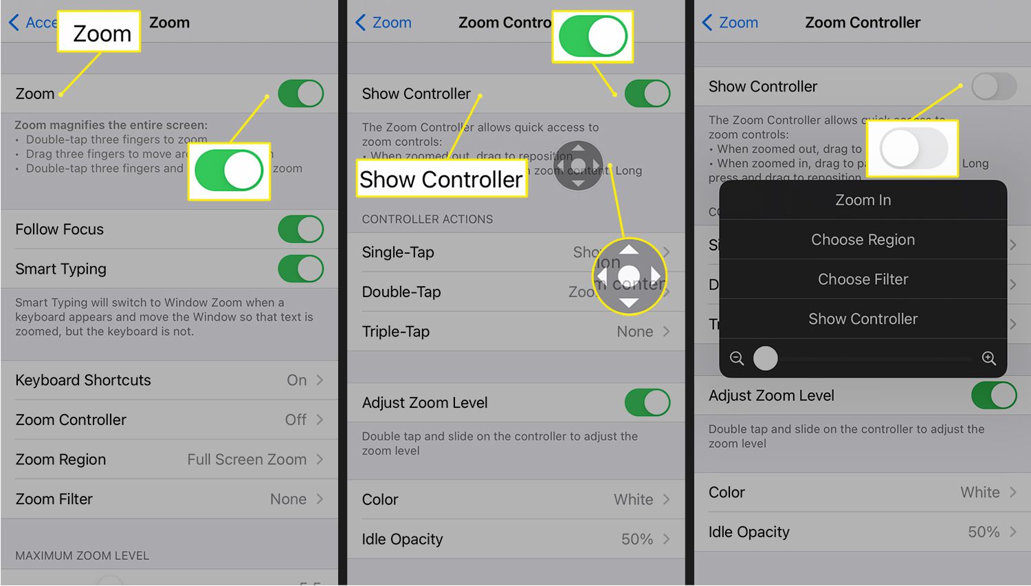 Instead of showing the controller at all times, use a three-finger double-tap to bring up the controller on the fly from the Zoom menu. Use the other options to zoom in, change the zoom region, or add a filter.