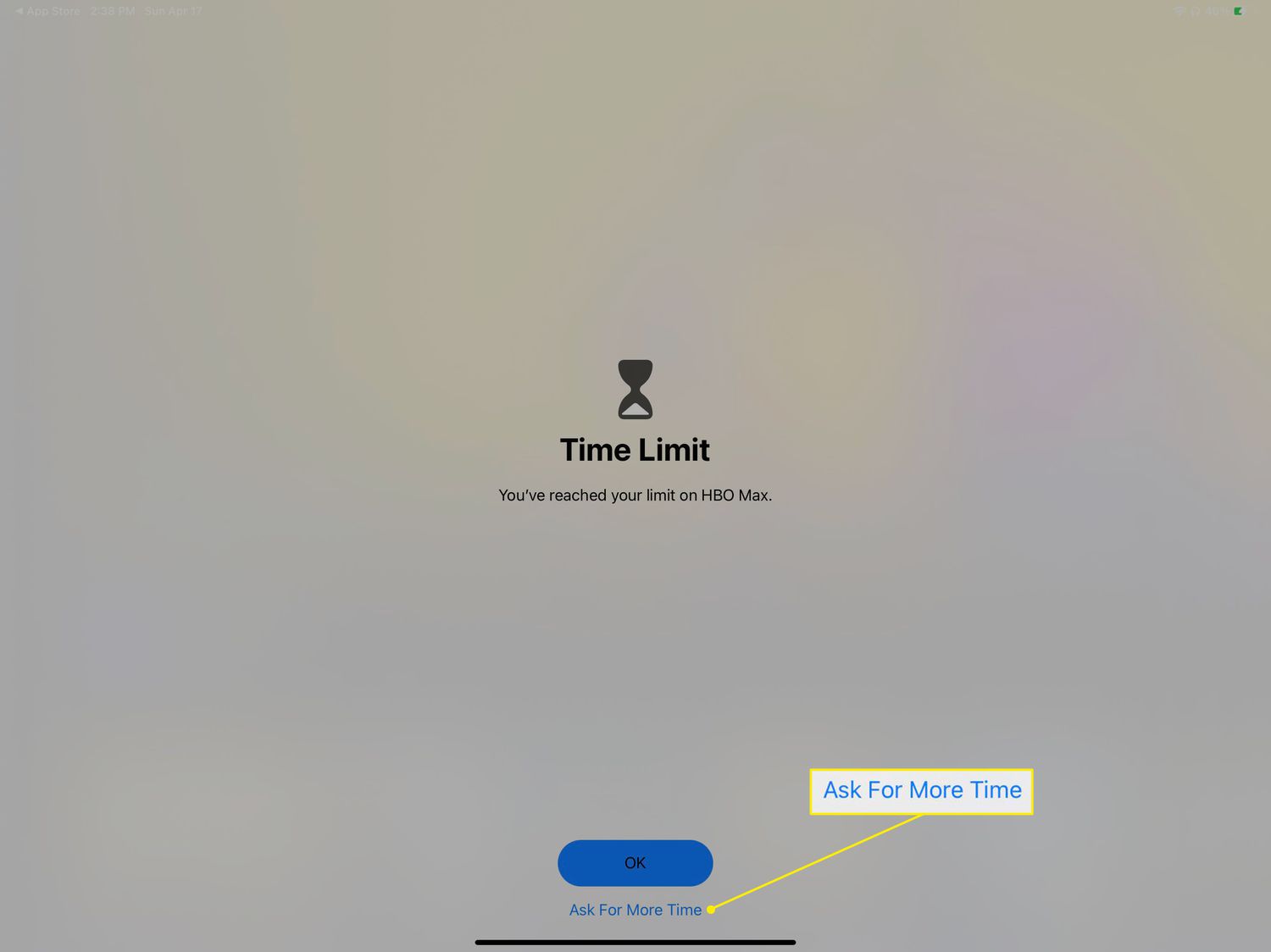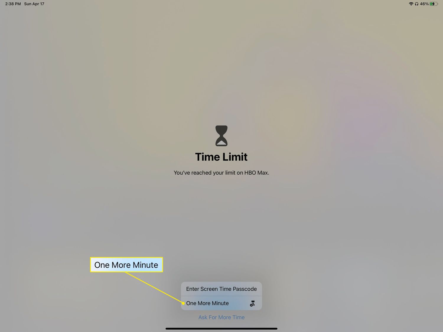 - Then, tap Ask For More Time > One More Minute. Once the timer runs out, the app is locked behind a password.