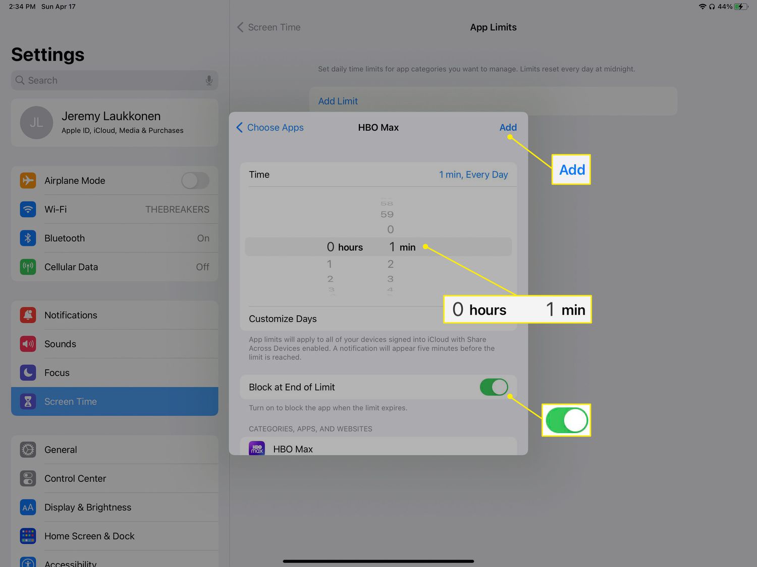 Set the time to 0 hours 1 minute, make sure the Block at End of Limit toggle is on, and tap Add.