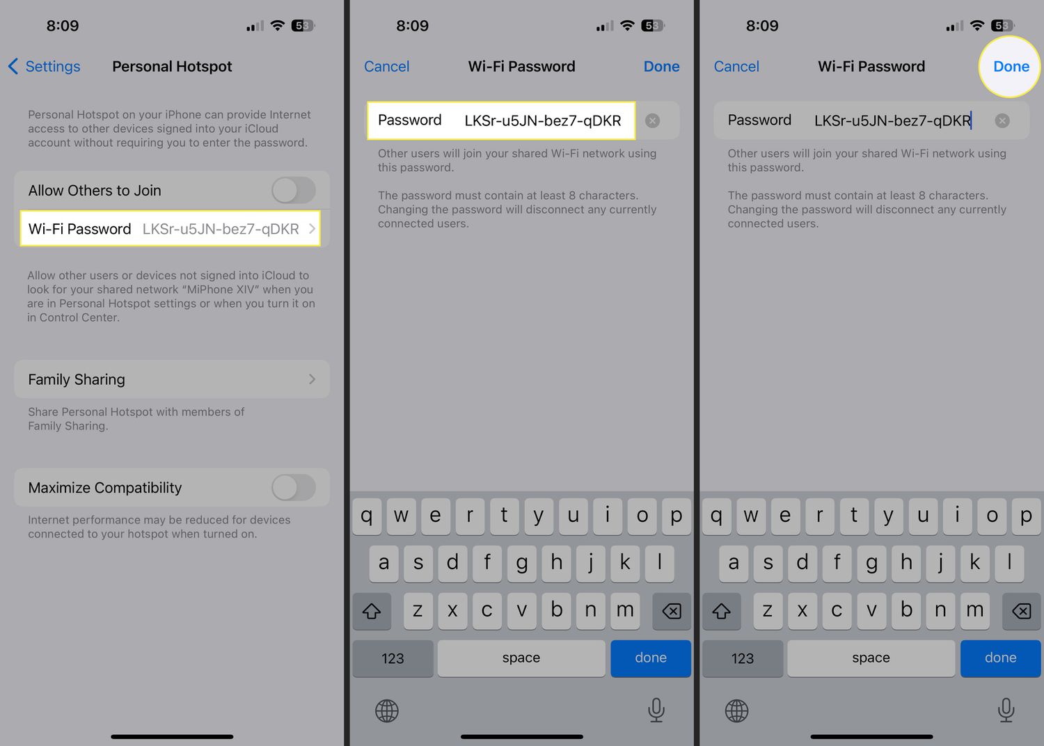 Note the password listed on this screen. If the default password is too hard to remember, you can change it by tapping it and entering a new one on the next screen. Tap Done to save the new password.