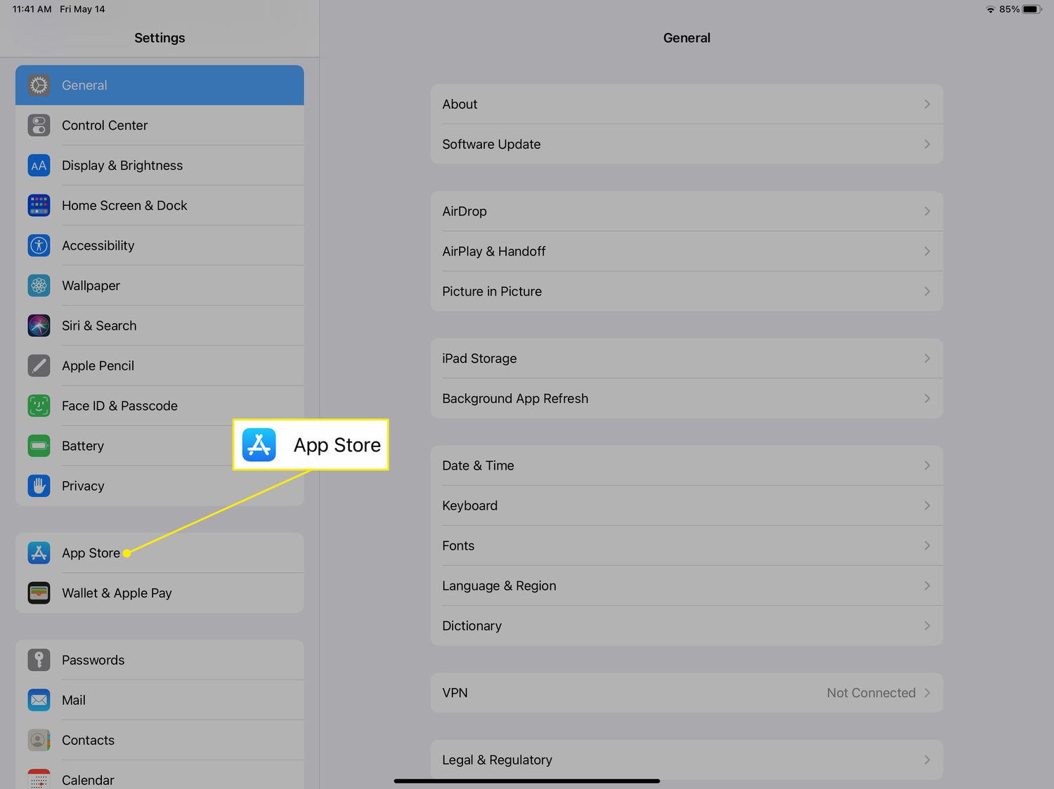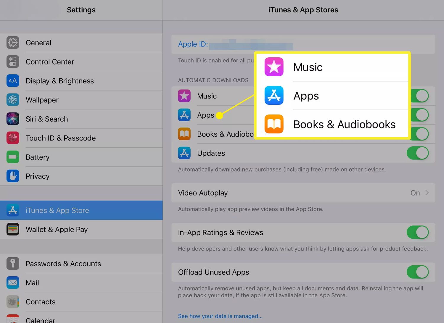 Tap App Store in the Settings sidebar in iPadOS 13 and iOS 13 and later, or select iTunes & App Store in the sidebar in iOS 12 through iOS 9.