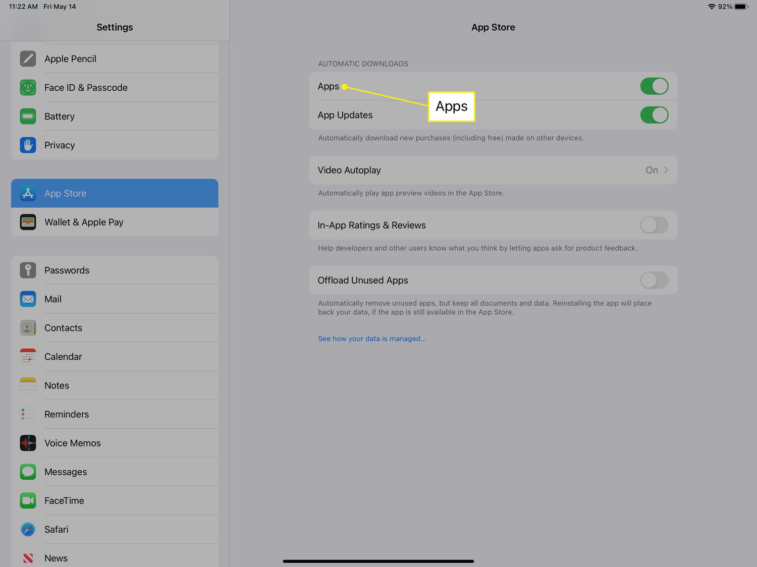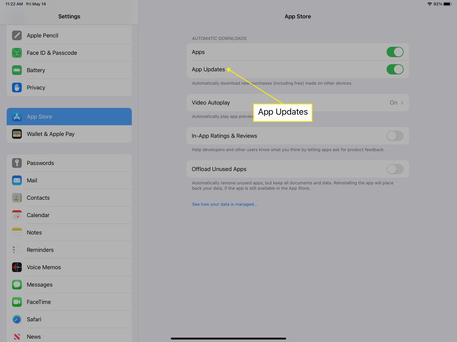 - Settings > App Store. Under Automatic Downloads, turn on Apps/App Downloads and App Updates.