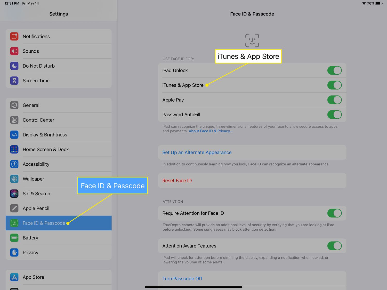 - Set up Face/Touch ID to download: Settings > Face ID & Passcode (or Touch ID), enter passcode, and toggle on.