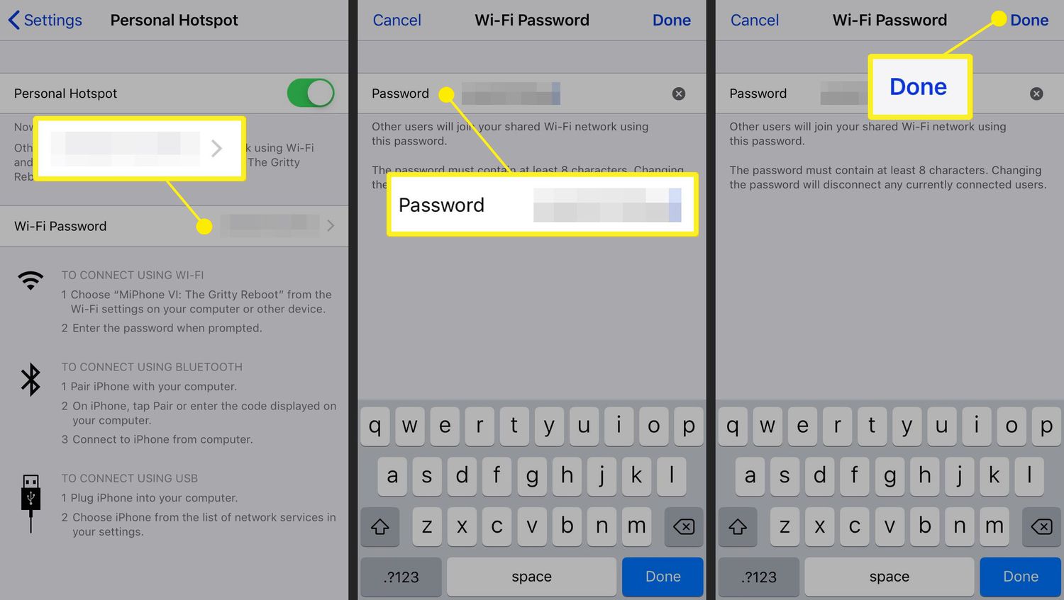 The Wi-Fi network shares its name with your phone, and the password is next to Wi-Fi Password on the same screen.