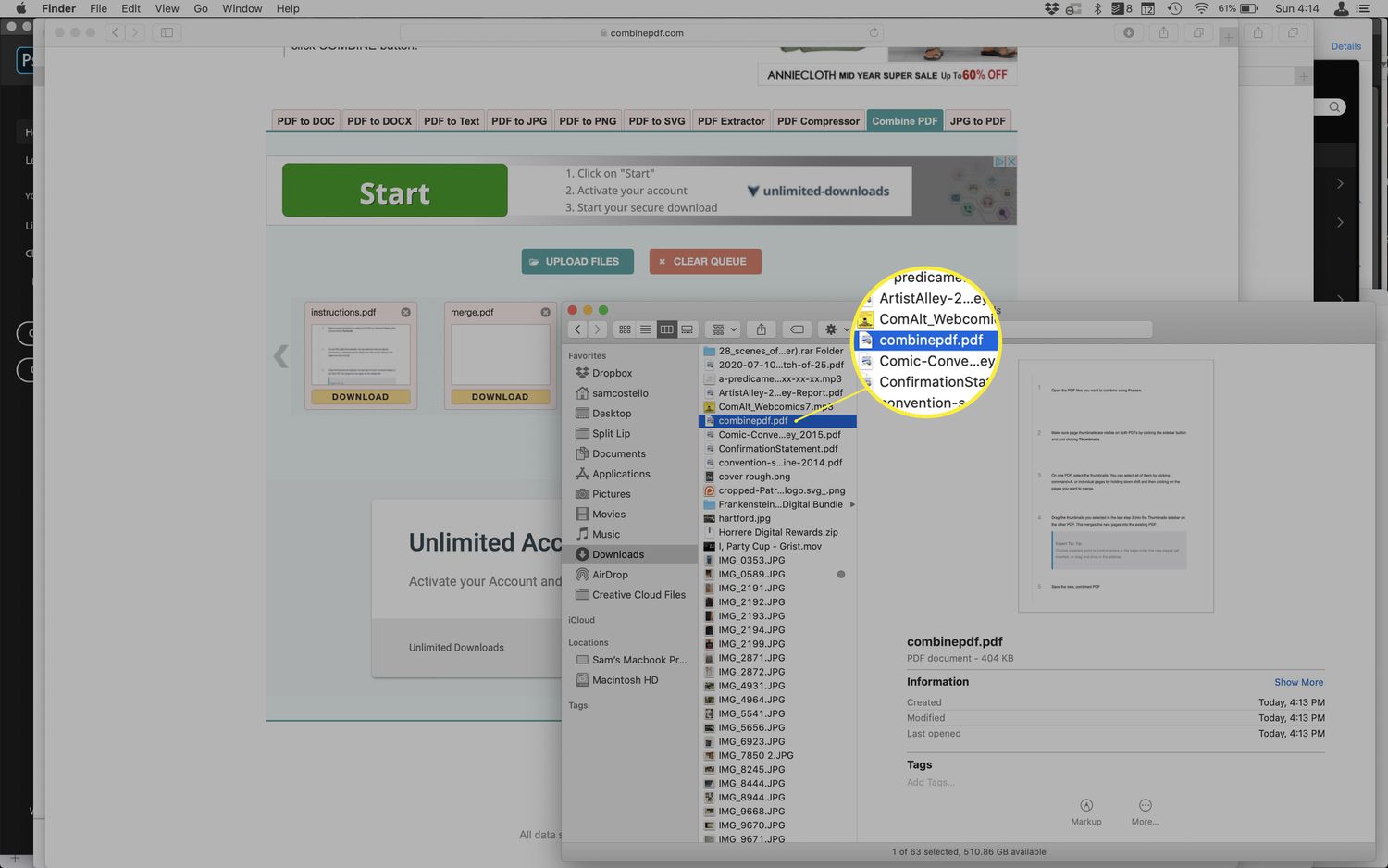 The combined PDF automatically downloads to your Mac's Downloads folder. The PDF will be named combinepdf.pdf.