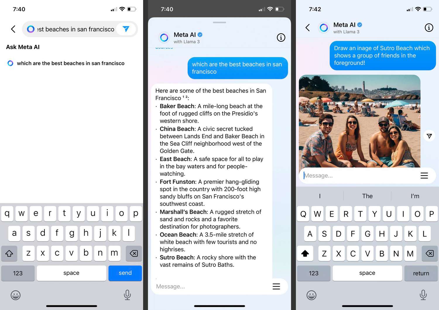 You're planning a beach trip with friends in an Instagram Group chat. Use the search field and Meta AI's auto-suggestions to find the perfect beach for everyone. At the end of the day, describe your beach day with keywords (surfboard, palm trees, etc) and ask it to draw an image. Meta AI whips up a memorable photo for the whole group in the chat.