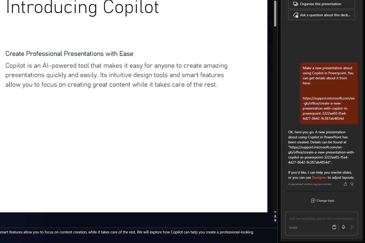 In this example, we had Copilot produce a guide on how to use Copilot in Powerpoint, using a link to Microsoft's explainer page about the technology.If you're unsure about how to write a prompt for Copilot, you can select the Prompt Book icon next to the Microphone at the bottom of the chat window. This will provide you with a number of pre-written prompts to select from.