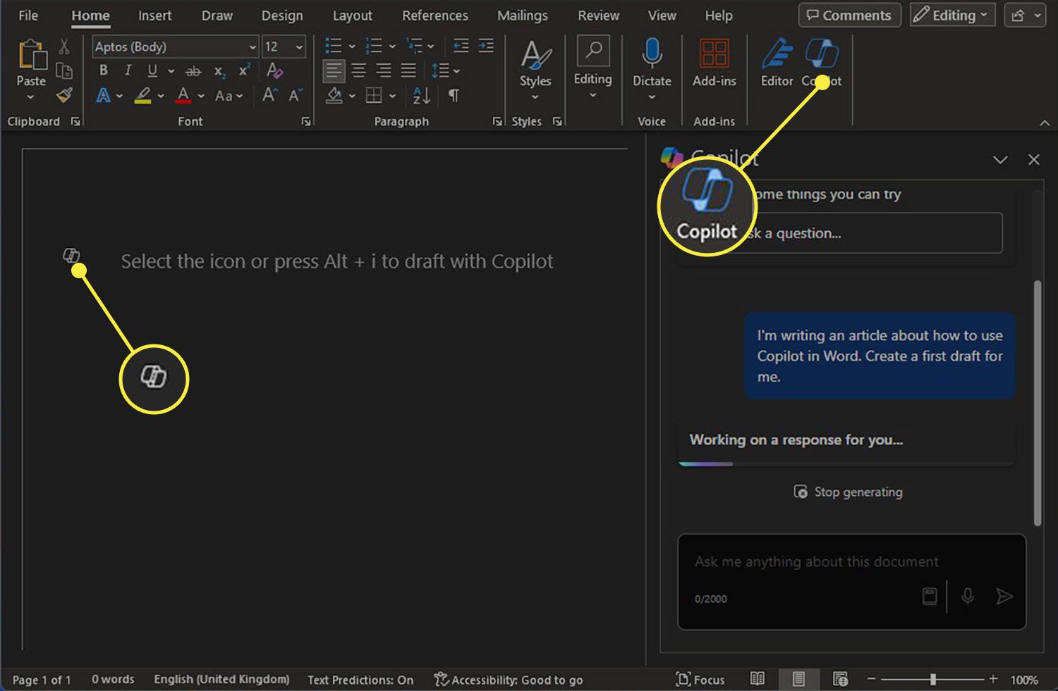 Select the Copilot icon within the document itself, or press Alt + I to launch Copilot drafting.