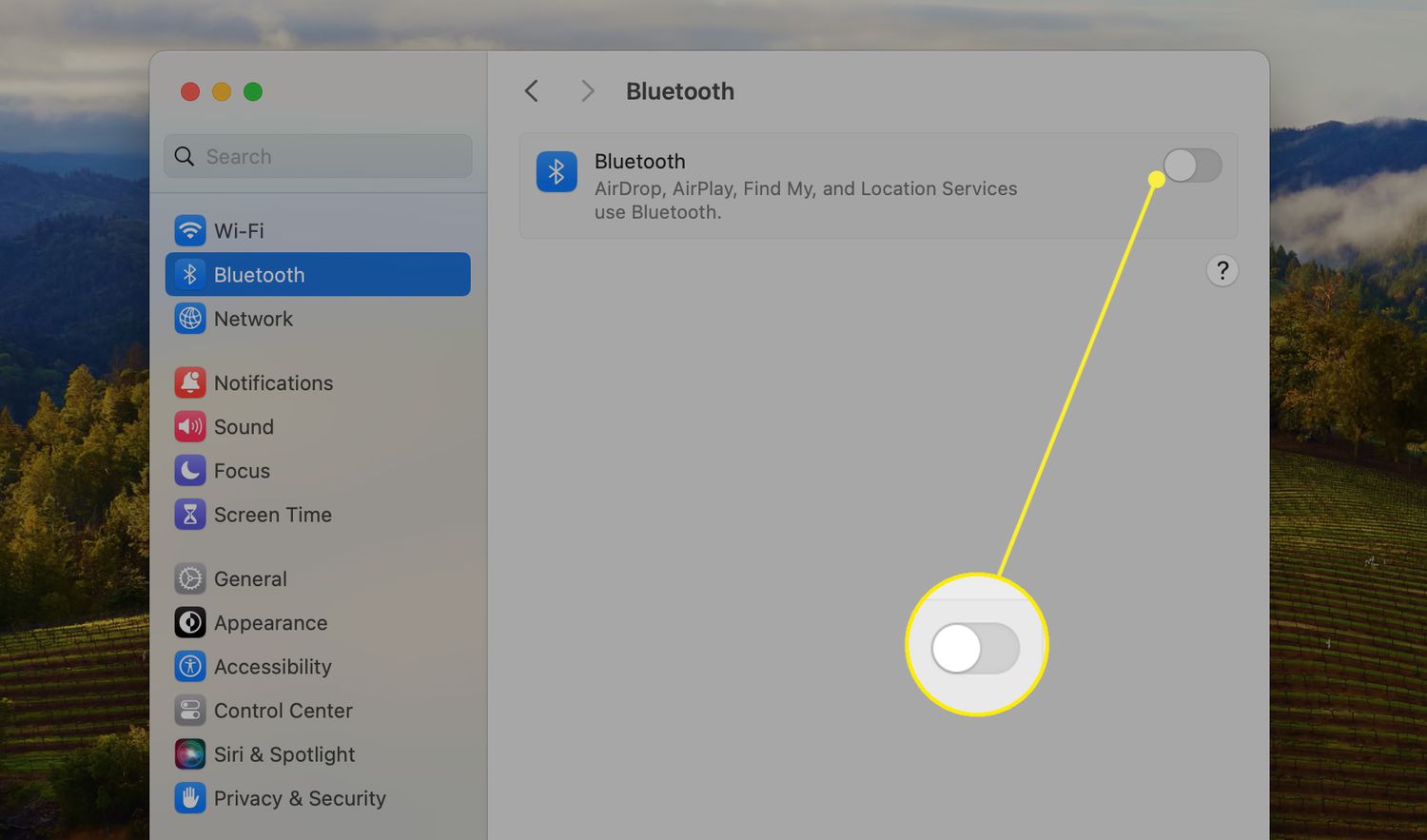 - Turn Bluetooth on and off: Click the Bluetooth menu in the top right corner > toggle/turn off Bluetooth > then toggle or turn it back on.