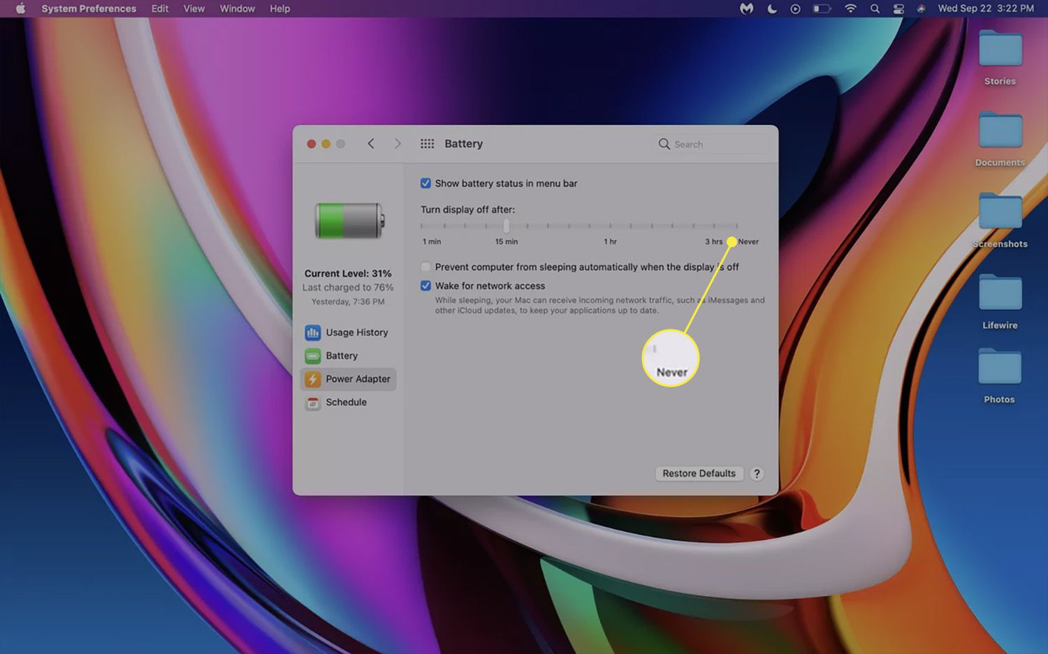 If you don't see that option, go to Battery > Power Adapter instead, then select the slider and move it to Never.