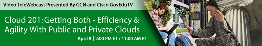 And we'll use the series as a way to keep you informed of any events related to cloud and government. As an example, you can check out Cisco's GovEduTV, which provides access to cloud-related town halls. One specific event listed there that you absolutely won't want to miss is "Cloud 201," a session on April 9 about getting efficiency and agility with public and private clouds. Click on the banner below for complete details, including registration. This session is the follow-on session to "Cloud 101," now available on-demand, which was a primer on cloud for government and education professionals.