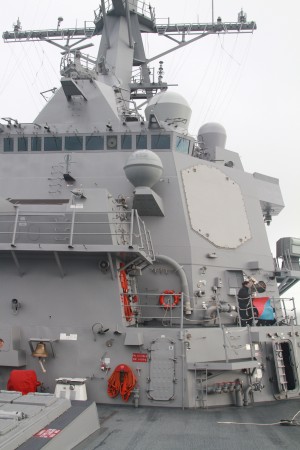 We then exited the helo and were lead inside one of the two helo hangars on the Spruance where we were greeted by the ship's captain, Commander George Kessler, and Ensign Joe Horn, the public affairs officer for the Commander Kessler (Ensign Horn's main duty was as a weapons officer). We met with Commander Kessler, his XO and Ensign Horn in the officer's ward room for a brief history of the ship, some specifics on Arleigh Burke Class destroyers, background on Admiral Spruance and why his name-sake was used for this ship. After that we began a tour of the entire ship, from standing on the bow next to the 5-inch gun and forward missile deck to walking to the aft section missile deck, viewing the Sea Whiz cannon and the devices that allowed them to resupply at sea. Then we went back inside the pressurized interior of the ship, down through the tiny ladder spaces to the engine room, mess hall, helo hangars, and generally every area of the ship except for the crew's living quarters. We avoided that area as there are always crew sleeping depending on watch/shift schedules and they don't want the crew to "feel like animals in a zoo".