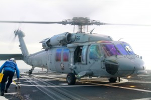 Once everyone was strapped in and after a short taxi to the designated helipads, we lifted off and began our trip out to the ship. We were told the weather wasn't ideal out at the ship and we might not be able to land (as they don't take chances with civilians on board if they don't have to). The weather was overcast and raining, but it was a light rain and our 45-minute flight was surprisingly smooth. Not having radios in our headsets, there was no communication from the crew so we didn't really know when we'd reach the ship. However, I felt us begin to descend and after a few short moments, I saw the wake of a ship down in the water and could tell we were on way down to the Spruance. After a few seconds, I saw the aft section of the ship and very noticeable sight of a helipad as it continued to cruise. We hovered very briefly and touched down amazingly smoothly and much quicker than I anticipated given the slightly rough seas. This crew (part of the "Blackjacks" squadron) made landing on a moving target with VERY little margin for error seem like a simple, routine event.