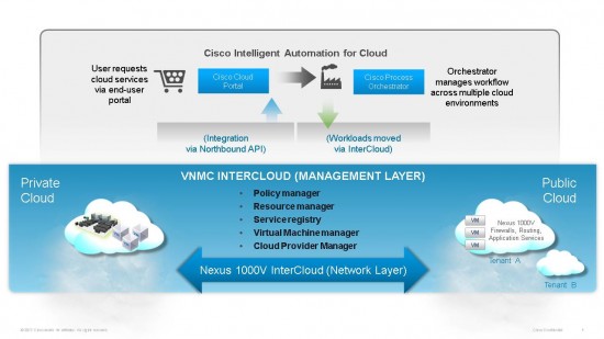 VNMC InterCloud manages the hybrid cloud network, and interfaces to cloud orchestration tools like Cisco Intelligent Automation for Cloud (IAC) for workflow automation and cloud catalog services through the northbound API