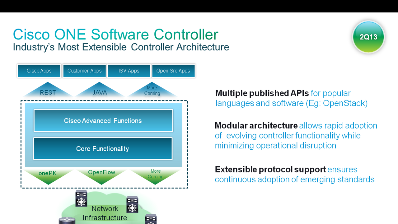 The Cisco R&D team has been quietly executing as well. The result of their efforts is that we're announcing the Cisco ONE controller framework, targeted for availability in 2Q CY13. It will support onePK and OpenFlow on its southbound interface, while being extensible to support additional protocols over time. Similarly it will have an extensible northbound interface with REST, Java and other protocols coming over time. In addition to the Network Slicing application that we had already announced earlier, Cisco is introducing two new applications for Network tapping and Custom forwarding. Over time, we expect more Cisco apps as well as third-party ISV apps to be built and integrated with the controller.