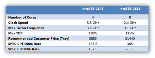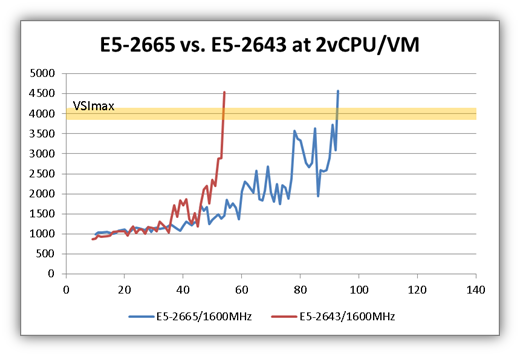 What about 2vCPU virtual desktops? We tested that, too, since a fair number of our customer projects involve some number of users (an overwhelming minority) who require or who demand 2 vCPUs. Both systems obviously hit VSImax at a much lower density when each virtual desktop was allocated 2 vCPUs. You might expect to achieve half the density, but it was actually much better than that. In fact, the E5-2643 based system exceeded VSImax at 54 desktops while the E5-2665 based system exceeded VSImax at 93 desktops (72% more desktops than the E5-2643 based system). This result also strongly suggests that core count has a much greater impact on virtual desktop density than CPU speed.