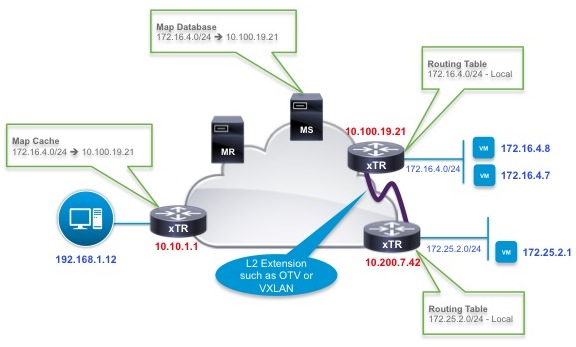 Let's build on the scenario we have been using in the prior posts, where we have a host 192.168.1.12 is chatting with a VM 172.16.4.7. Assume that we have gone through the whole map-request/map-reply process, so we have something that looks like this: