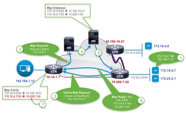 Now if 172.16.4.7 initiates traffic back to 192.168.1.12, the router 10.200.7.42 (the xTR serving 172.16.4.7) will send a solicit-map-request message to 10.10.1.1 (the xTR serving 192.168.1.12) telling it to send out a map-request message for 172.16.4.7, even thought it thinks it already has a valid RLOC for that address. 10.10.1.1 will send out a new map-request for 172.16.4.7 which results in 10.200.7.42 sending a map-reply back which then leads 10.10.1.1 to install the /32 EID/RLOC info in its map cache.