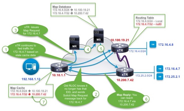 Any brand new conversations destined for 172.16.4.7 are easy, they will go through the normal LISP map-request/map-reply process, so pretty simple on that front.