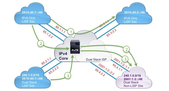 - In the second scenario, we have an IPv6 LISP site with an IPv4 ISP communicating to a dual stack non-LISP site with an dual stack ISP. In this case the PxTR acts as an intermediary, with a tunneled IPv4 path between the source and PxTR (IPv4 outer address, IPv6 inner address), followed with a natively forwarded IPv6 path between the PxTR between the destination site.