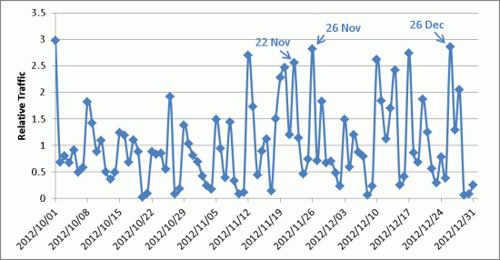 Thursday, December 20, marks a clear change in browsing behaviour. Traffic on Friday, December 21, is lower than would be expected for a Friday, and the rise on traffic on the following Sunday is not seen. Traffic on Christmas Eve is about 40% of a normal weekday. However, the amount of traffic on Christmas Day, 24% of normal, isn't noticeably different from that of a typical Saturday.