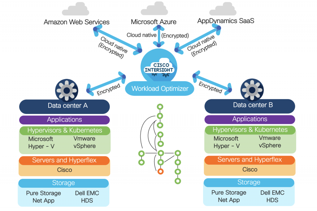 Intersight Workload Optimizer relies on data -metrics, telemetry, etc. -from a vast array of software and hardware endpoints, both on-premises and in the public cloud, to analyze and generate its actions. Intersight targets allow IWO decision engine to gather that information in real-time, and where appropriate, execute actions that assure workload performance while simultaneously optimizing for cost. A combination of Intersight Device Connector, Intersight Assist, and public cloud API compatible technologies enables this powerful capability in a secure, durable, low maintenance fashion.