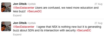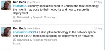Our first SecureDC twitter chat created some great industry dialog around security for Software Defined Networks (SDN) as well as using SDN to improve security. SDN is going through a similar hype cycle as seen with cloud and we feel that it's important to focus more on education now and broader collaboration, so that users can benefit from the tremendous potential SDN holds.