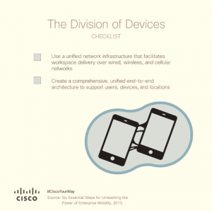 Today we discussed a short checklist for preparing organizations for the division of devices. For more information about virtualization and additional steps to consider, check out this Cisco whitepaper, "Six Essential Steps for Unleashing the Power of Enterprise Mobility." Stay tuned for my next post that will discuss the fourth step enterprises can take to unleash the power of mobility.