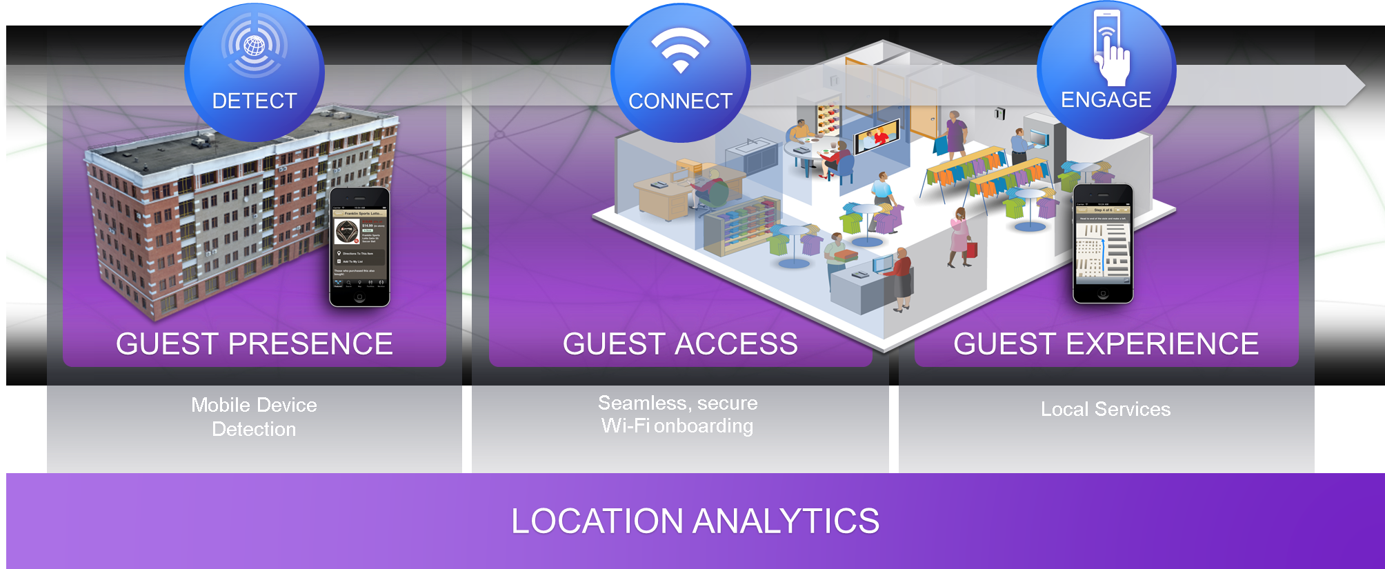 The Connected Mobile Experiences solution uses Cisco Wi-Fi infrastructure-access points, controllers, Mobility Services Engine (MSE), and management -to detect, connect, and engage end users and to provide unique insight to venue owners through location analytics.