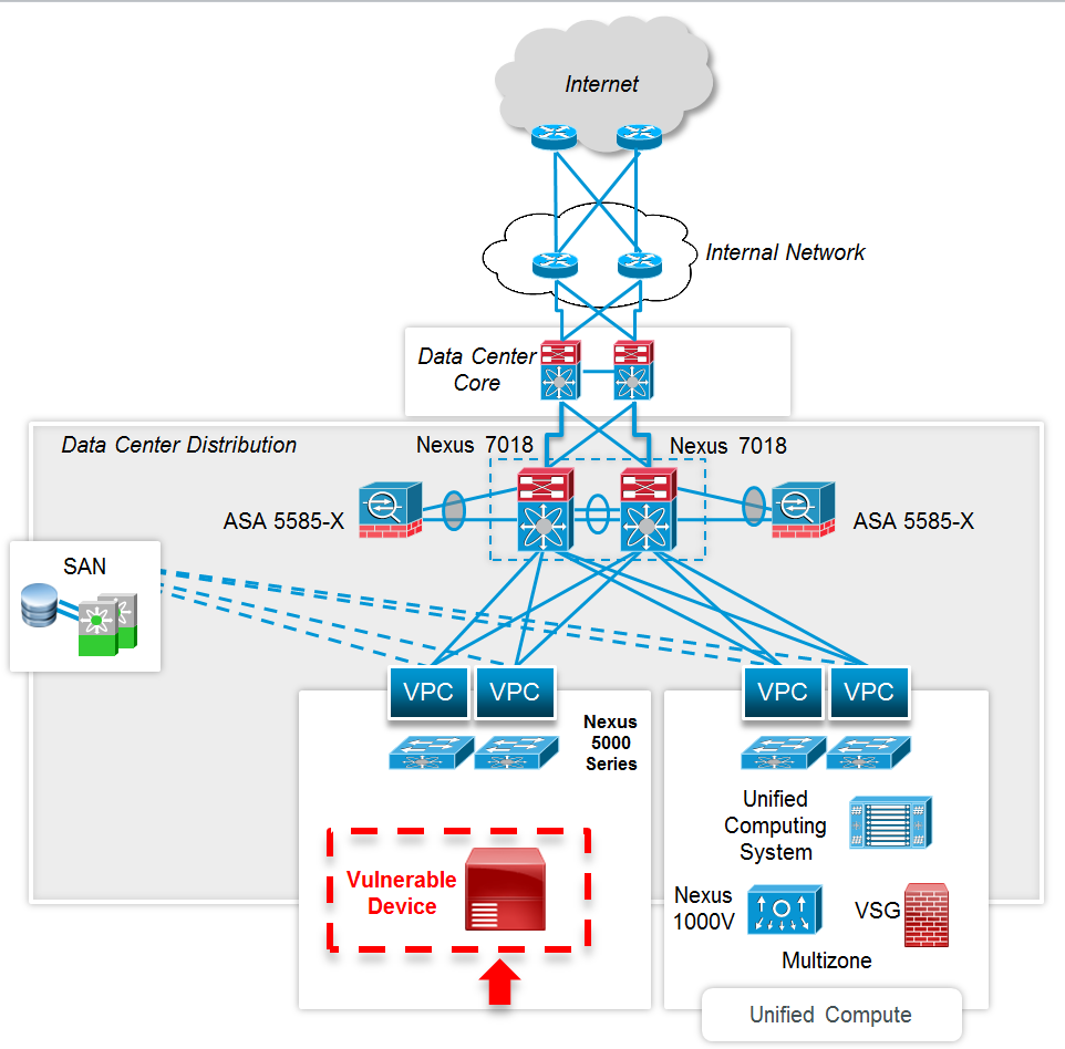 You can create these "onion diagrams' in many different ways, depending on where topologically your vulnerable device resides and how you want to visualize each mitigation and identification technique. The following figure shows a very high-level topology of a typical enterprise network. In this example, a device in the data center (shown in red) is affected by a given vulnerability.