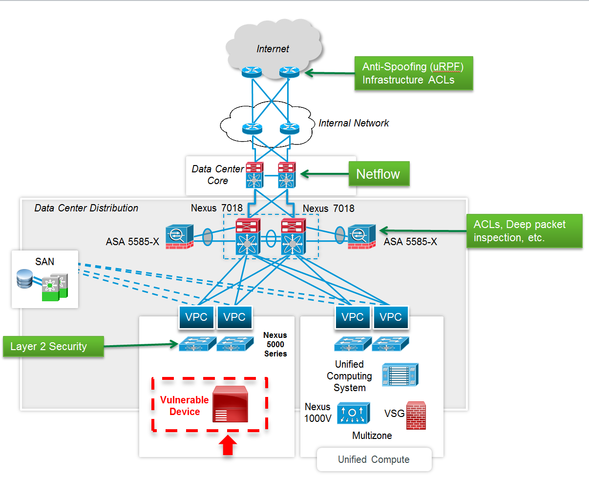 As you can see in this network topology, there are many network devices that can provide different mitigation and identification capabilities. For instance, adjacent switches can provide Layer 2 mitigation capabilities. Cisco ASAs can be configured to only allow transactions from trusted devices or block specific exploit traffic. They can also provide visibility through syslog messages and counter values displayed in the output from show commands that may be included within the AMBs, where applicable. Cisco IOS NetFlow records can provide visibility into network-based exploitation attempts. Some of these techniques and "device roles" are illustrated in the following figure.
