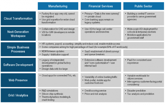 Although they are all motivated by similar drivers and inhibitors, every enterprise will make its choice of cloud technologies in the context of its vertical-specific business strategy, and technical solutions will need to link and appeal to business drivers. Cloud service providers, then, need to adapt their go-to-market, sales, and product-bundling strategies to reflect vertical specifics.