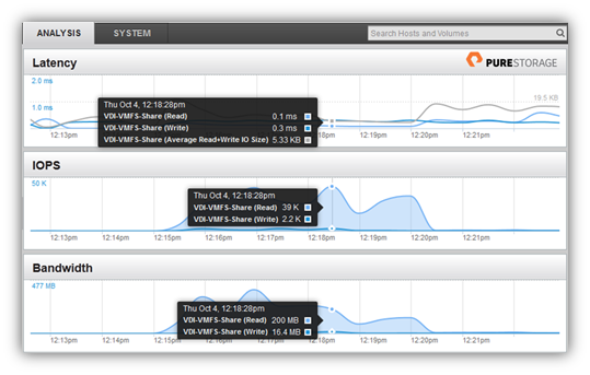 In our lab, we were fortunate to get our hands on an all flash PureStorage array with some pretty awesome low latency IO delivery capabilities. Keep in mind, it is a lab, so this config is not a validated design or in our HCL right now, but it does give us an idea of the storm to hit the storage when there is a low latency storage device behind the VDI cluster.