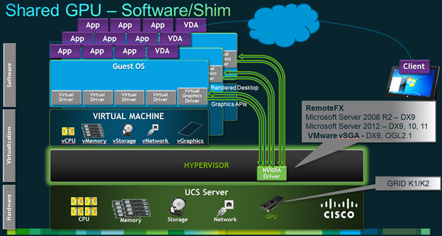 - vGPU uses a Native Nvidia driver and full DirectX11 OpenGL 4.4 support