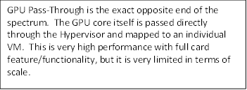 - Pass-through allows full performance and card features, but it is literally a 1 to 1 mapping of user to GPU = not very scalable