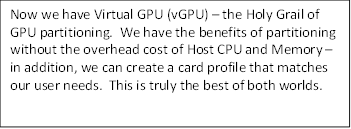 We've played with GPU's in servers for VDI before, what makes this so special? If you look closely, you'll see that the GRID cards are able to be partitioned into smaller card segments. This is NOT the same thing as software/shim approaches to "virtualize" the GPU and share it amongst several desktops. This is also NOT the same as Pass-through GPU's (1 VM to 1 GPU core). The GRID cards can be hardware partitioned into various video cards -this is called vGPU. There are several advantages to using vGPU over software/Shim solutions:
