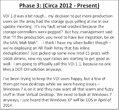 So it looks like everything is good? We've witnessed the humble beginnings of putting desktops on a hypervisor and we've even got to the point that it's almost cost feasible to do this! The past several years our VDI Administrator has struggled to get Windows XP tweaked and tuned to be lean, mean and efficient with their hardware. It has taken a couple of different storage solutions, compute configurations to get to the point that everything seems really, seriously, ready for production to most of the users in the organization. Well our VDI Administrator is about to find out that something is drastically different.