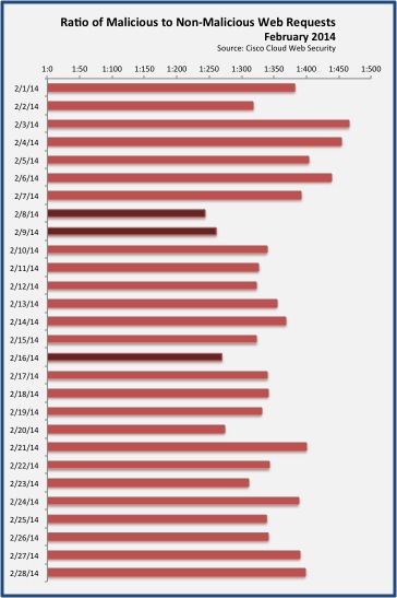 The ratio of unique non-malicious hosts to unique malware hosts was fairly constant between the two months, at 1:4808 in January 2014 and 1:4775 in February 2014. Likewise, the rate of unique non-malicious IP addresses to malicious IP addresses was also similar between the two months, at 1:1330 in January 2014 compared to 1:1352 in February 2014.