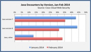 While Java malware encounters were 4% of all web malware encounters in January 2014, that rate increased to 9% in February. Of particular interest was the increase in the rate of Java malware encounters involving versions older than Java 7 or Java 6, which increased to 33% of all Java malware encounters in February 2014 from just 13% in the month prior.