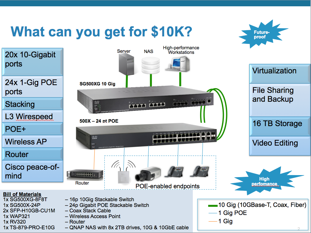 1x SG500XG-8F8T -16p 10-Gigabit Stackable Switch 1x SG500X-24P - 24p Gigabit POE Stackable Switch 2x SFP-H10GB-CU1M -Coax Stack Cable 1x WAP321 - WIFI Access Point 1x RV320 - Router with 4 Gigabit Ethernet ports 1x TS-879-PRO-E10G -QNAP NAS with 8x 2TB drives, 10G, and 10GbE cable (combination of TS-879-PRO, LAN-10G2T-D, 8x ST2000DM001) * This NAS is one of many options - specific one used here as an exampleA decade ago, $10K would have gotten you just one 10 Gig port on a Switch and one 10 Gig Server adapter port.