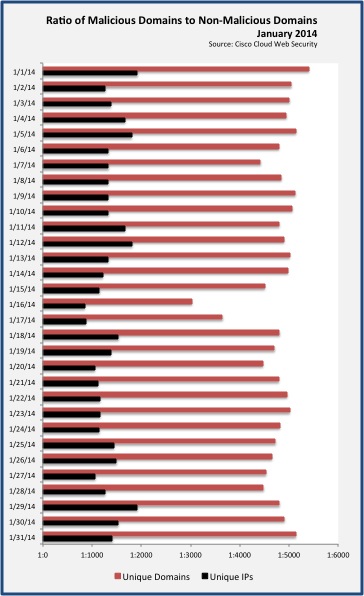 January 2014 started with a bang, with one in every 191 web requests resulting in a web malware encounter. The Cisco Computer Security Incident Response Team (CSIRT) observed this same trend, witnessing a 200% increase in web malware encounters experienced by Cisco employees for the month. Overall, January 1, 25, and 26 were the highest risk days for encountering web delivered malware. In the chart below, the lower the number, the higher the risk of encounters. Still, with a median encounter rate of 1:375 requests, every day of January 2014 represented significant risk for web browsing.