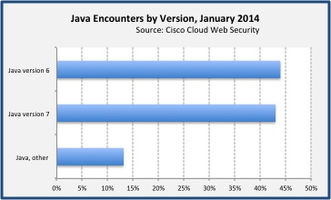 Java remains the most frequently targeted platform for vulnerability exploit. At 44% and 43% of all Java blocks respectively, Java v6 and Java v7 were equal targets of exploit in January 2014. In December 2013, Java v6 comprised 48% of all Java blocks compared to 40% for Java v7.