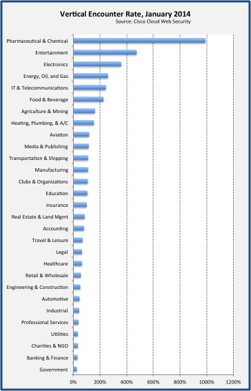 Companies in the Pharmaceutical & Chemical vertical experienced the highest rate of encounters with web-delivered malware. As seen in the Cisco 2014 Annual Security Report, this particular vertical has historically always been one of the highest at-risk of encounters. To assess vertical risk, we first calculate the median encounter rate for all enterprises, and then calculate the median encounter rate for all enterprises in a particular vertical, then compare the two. A rate higher than 100% is considered at increased risk.