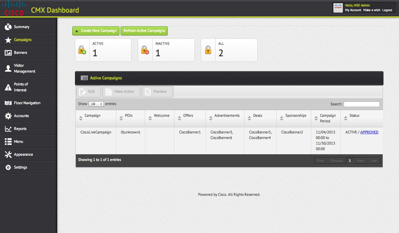 Browser Engage comes with a simple user interface, called CMX Dashboard. Sales or marketing representatives from organizations can login to this dashboard to setup the content for pushing out to mobile end users in the premises. Organizations have the option to serve up -two types of content: services and banners. The organization also has the ability to create "Campaigns" that contain the parameters for the execution plan for which banners and services to display based on time, date, location and many more parameters. You don't want to see a coupon for a glass of wine at 10:00am, right? That's exactly the kind of flexibility that is built-in to Browser Engage.