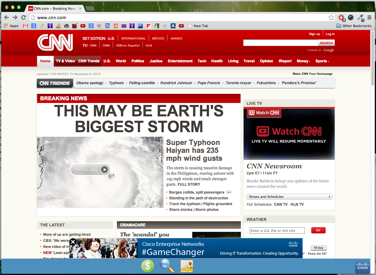 Figure 4 shows a screenshot of how www.cnn.com looks with the Browser Engage enabled. Notice how the banners that were setup in the Admin interface show up on the page. Also included are the Map and Search services. The entire user experience is highly customizable, including but not limited to Logo, Services Bar settings, Banner sizes, location of the services on the page etc. The experience is mobile-optimized so loading mobile version of the same webpage will give the user the same level of experience and access to the same services.