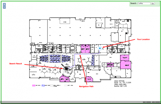 Before I conclude this post, I would like to talk about another important feature offered as part of Browser Engage. With "Indoor Floor Navigation", you will never get lost in a big conference center or a mall. It is very simple to use -Just launch it from any webpage, search for a keyword, find a store and navigate to the store all in one place. Figure 5 shows a screenshot of the Indoor Navigation on a Floor map supported on Browser Engage.