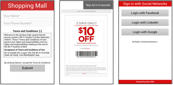 Figure: Sample Captive Portal pages configured with CMX Connect as experienced by guest accessing Wi-Fi