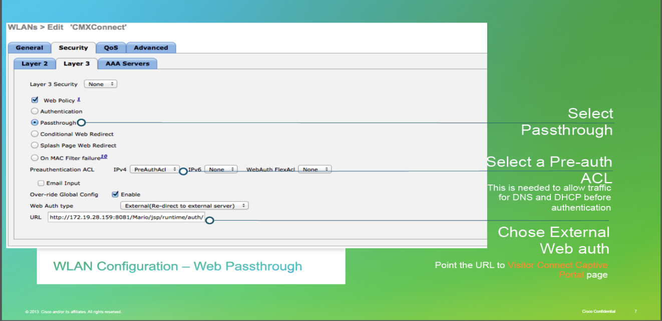 - WLCs with Guest WLAN should be configured with Open Layer 2 security and Web Passthrough Layer 3 security.