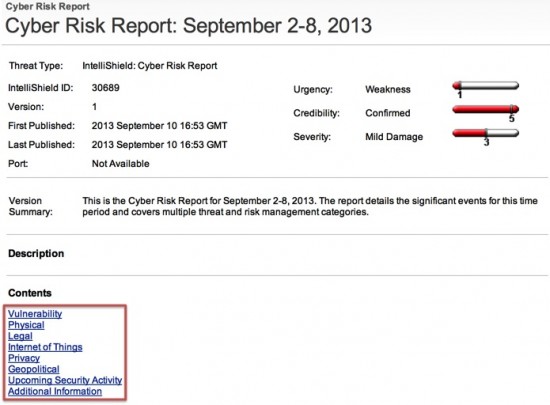 The Cyber Risk Report contains a summary and analyses of events and issues that transpired in the week leading up to its publication. Every week a specialized team of Cisco security analysts meets to create its content based on a review of several information sources. This content is organized into categories that I have highlighted in red as shown in the snapshot below.