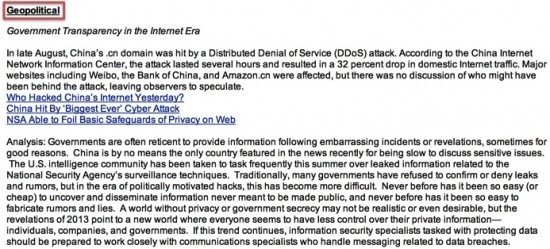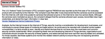 One of the things I like about the Cyber Risk Report is that the categories are not static and adapt to the security events and issues from one week to the next. For instance, an earlier edition had content under the categories of "Attack and Compromises" and "Security Trends." Below a few examples of the entries written for the "Internet of Things" and "Geopolitical."